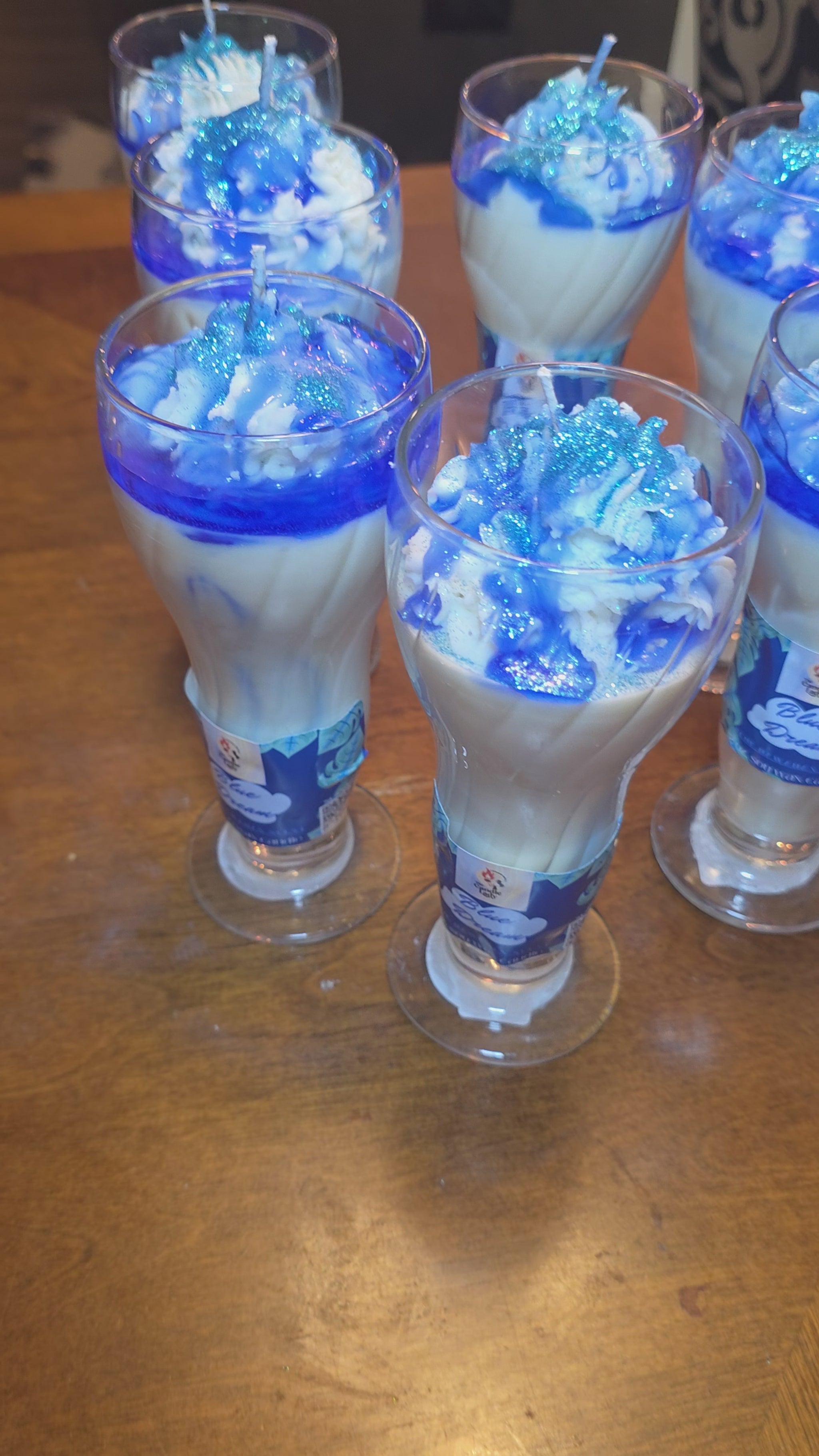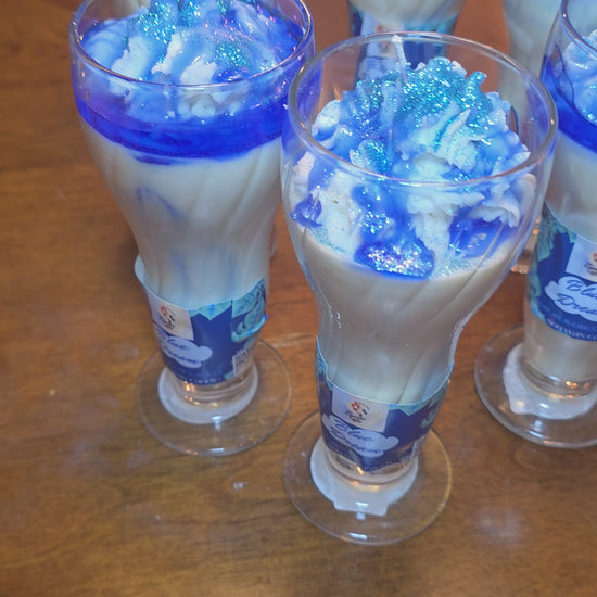 Each candle is drizzled and topped with shimmering blue gel wax and glitter accents, creating a sparkling ocean-inspired finish. Stunning blue swirls dance throughout the creamy soy wax, making every candle a one-of-a-kind work of art.