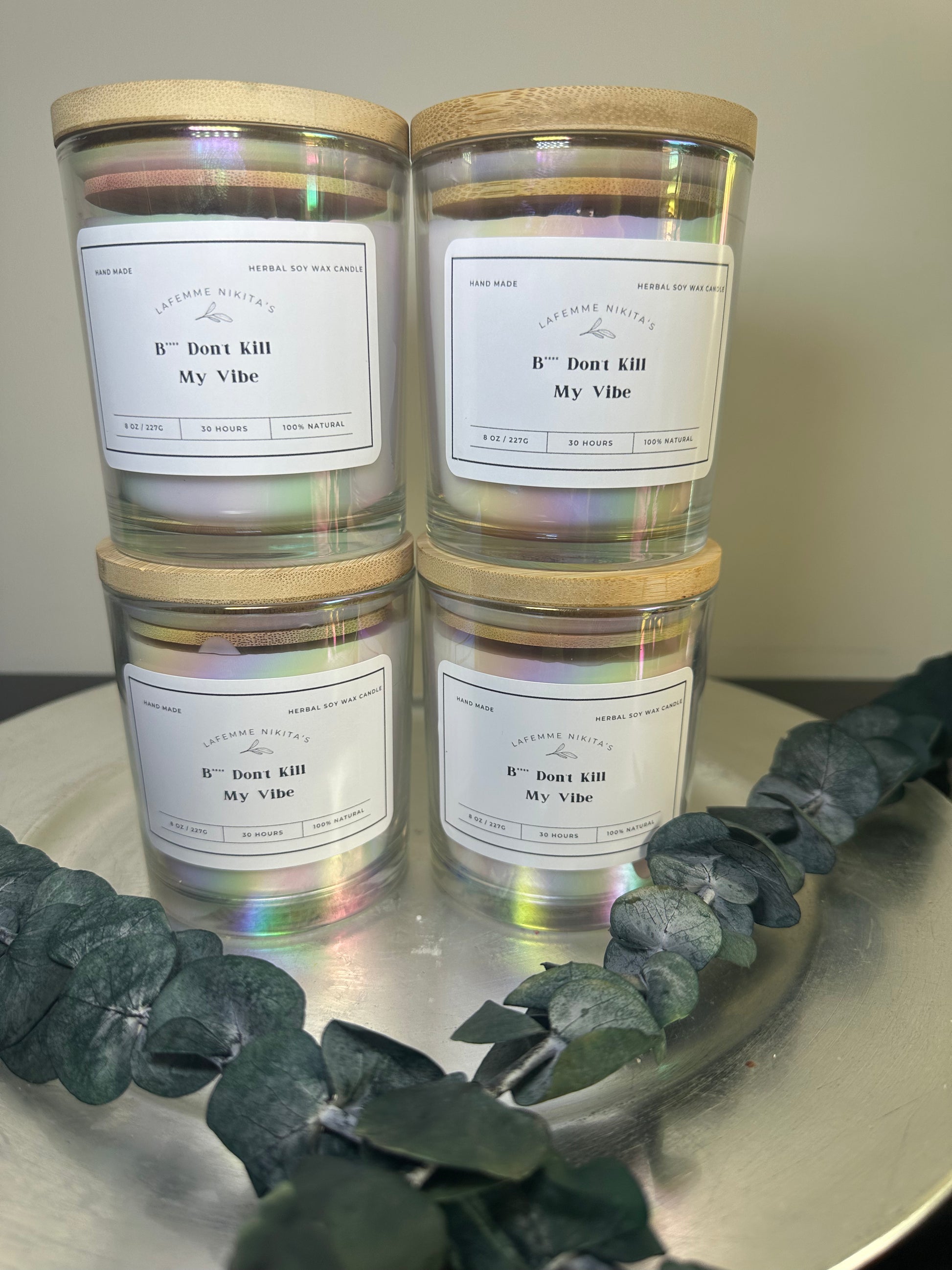 Set the mood and block the bad energy with "Bitch Don’t Kill My Vibe"—a candle made for chill queens and vibe protectors. This 8 oz candle blends the calming scent of lavender with the fresh, uplifting aroma of clean linen, creating the perfect atmosphere for relaxation, self-care, and unapologetic peace.
